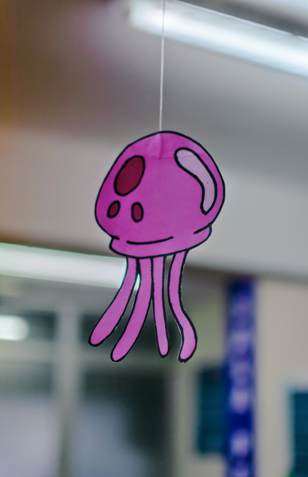 Para la decoración de la sala utilizamos detalles típicos del fondo marino, que es el escenario donde transcurre la serie de dibujos.